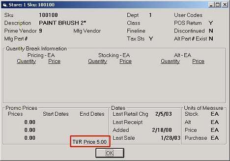 In the Inventory File, an item on an active TVR promotion displays the TVR price in the Promo Item Inquiry window. To view the window, display the item in Inventory Maintenance, click Misc, and then select "Display Quantity Break and Promotion Pricing."