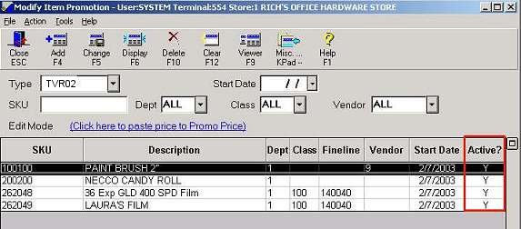 In the Promotion File, an item on an active TVR promotion will have a "Y" in the "Active" column.