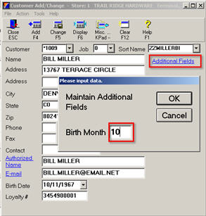 Once True Value begins allowing option 1044 "Enhanced TV REWARDS Loyalty on System" to be set to Yes, if you select Birth Month in option 9130, you can access the Birth Month field from the Customer Add/Change window by clicking Additional Fields.