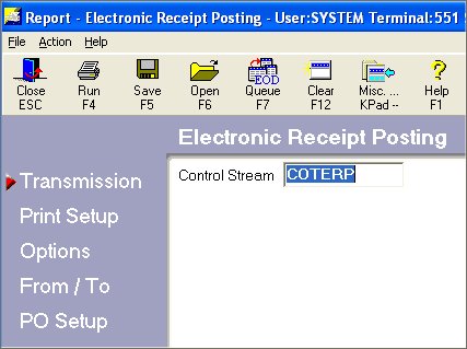 To receive the A-Copy for your weekly warehouse order, leave the default of COTERP if that's the name of your control stream, or enter the control stream name you use to receive invoices.