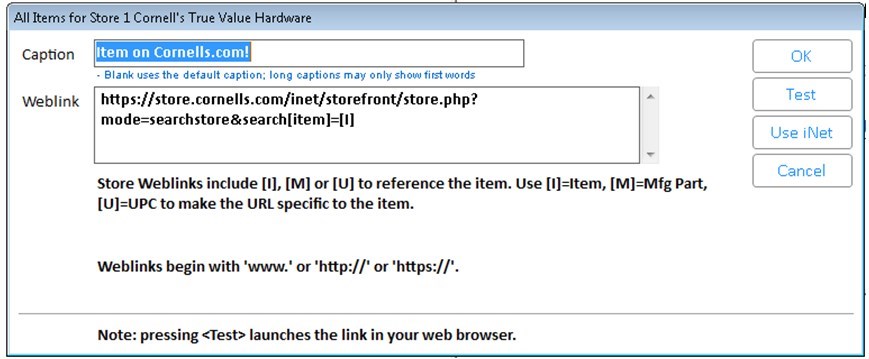Use the “Test Item” button to test if the link leads to the desired webpage. If you used a token [I], [M] or [U], you will be asked to enter an item / mfg part# or UPC to be used during the test.