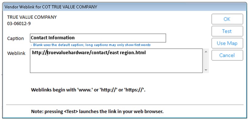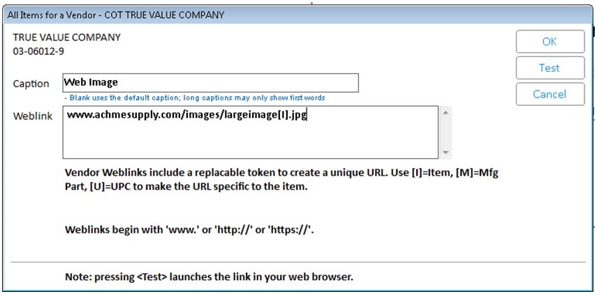 This describes how to link specific vendors to a specific URL’s. Vendor specific URL’s are always setup one item at a time. A vendor can only have a single weblink.