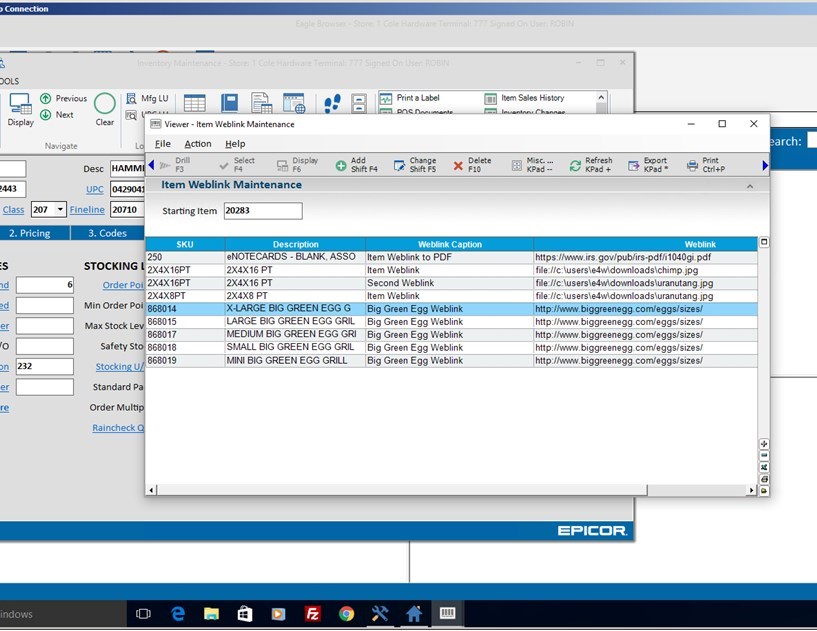 You can add and maintain the Weblinks in their applicable viewer. For example, in the Inventory Viewer use the Misc Menu choice “Add Weblink" to add a weblink for the highlighted item, or use “Maintain Item Weblinks” to access the Item Weblink Maintenance Viewer where you can see Weblinks for all items. The same functionality is available in the Customer and Vendor Viewers.