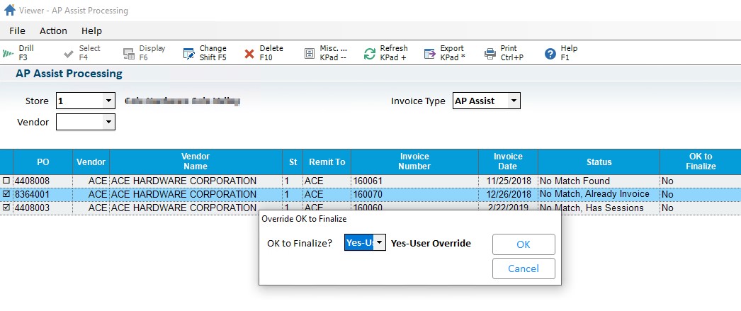 With no errors, this invoice can be posted to the receiving document immediately. If the invoice should not be posted to the receiving document, the OK to Finalize can be changed by pressing the Change (Shift F5) button. The OK to Finalize shows No – User Override.