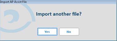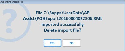 At the prompt, select Yes to delete the AP Assist file from the saved location. Selecting No to save the AP Assist file after the import.