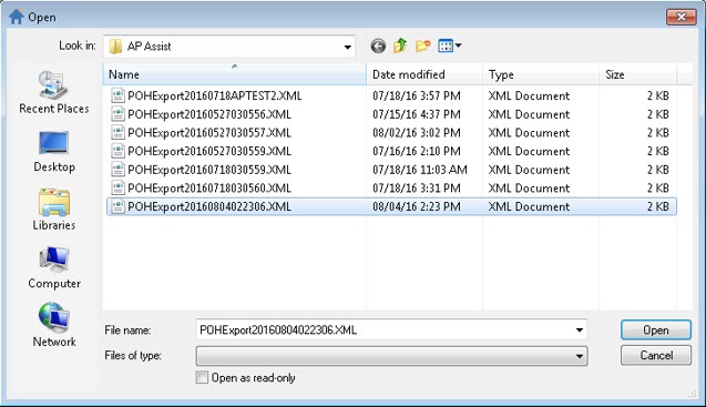 From the Open window, use the browser to navigate to your invoice AP Assist file: