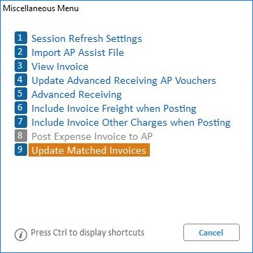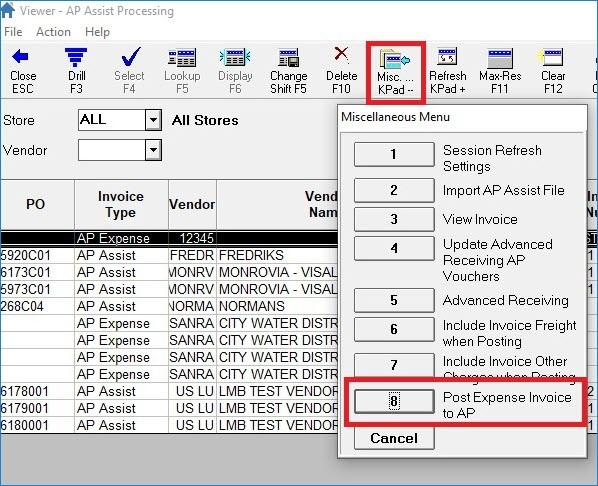 Note: Only AP Expense Invoice Type invoices will post using this Misc Menu option. The AP Assist Invoice Type invoices will still use Option 4 “Update Advanced Receiving AP Vouchers”.