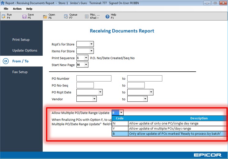 Set the Allow Multiple PO/Date Range Update to B – Only allow update of POs marked ‘Ready to process by batch’: