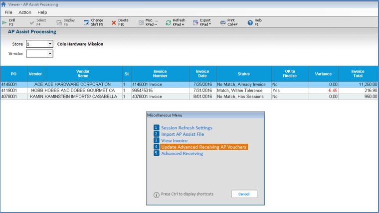 Use the AP Assist Processing Viewer to import invoices and post them against the receiving document based on invoice number and date, matching status, etc. The viewer lets you scan and analyze your invoices all in one place.