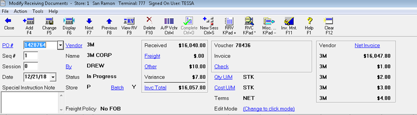 The RV document is now updated with the Invoice Freight/Invoice Other Charges and posted to Accounts Payable from RRV-F, APP and RATJ.