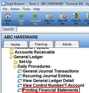 From the General Ledger Menu, under the heading "Daily Procedures," click Printing Financial Statements.