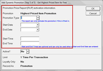 The Update Promotion Price (RUP) Report, used to start/end normal Eagle promotions, can be used to activate and deactivate Dynamic Promotions as well. This can be done when you are adding a new Dynamic Promotion or by selecting a Dynamic Promotion in the Maintain Dynamic Promotions Viewer and clicking Schedule. The scheduling is done in the highlighted area of the screen shown below. (Note that the title bar you see may be different; this example shows the scheduling screen for a “Get Highest Priced Item for Free” promotion.)