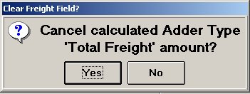 To remove the Adder type code from the PO, from the list, select None and click OK. A dialog displays asking if you want to clear the freight field. If you want to clear the freight field, click Yes. If you want to leave the freight amount as is, click No. Whichever answer you choose, the Adder type code is removed from the PO.