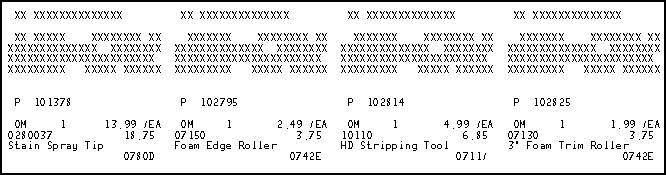 The following is an example of the report, printed using the Inventory file and the Standard Labels option. The first row in the example, a series of X's, is a test row. Click fields in the first item label to take you to the field definition.