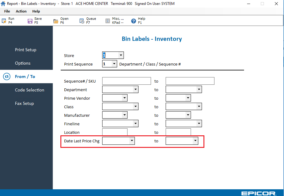 This selection criteria in the Bin Label report (RBL) allows you to look for item(s) in the selected store(s) where the date of last price change is equal to the date range entered in these fields.